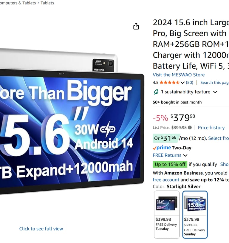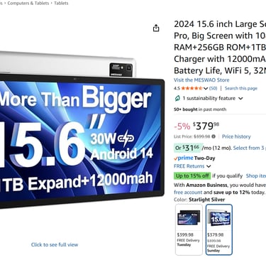 1080P FHD IPS 15.6-INCH LARGE-SCREEN TABLET: MESWAO android tablet 15.6 inch features a spacious 15.7×10×1.96-inch design, offering a screen area 2.4X larger than a 10-inch tablet. With an 85% screen-to-body ratio and a display size equivalent to A4 paper (210×297 mm) which the ideal choice for digital sheet music, eliminating the hassle of frequent page-turning. Perfect for medical, restaurant, conference follow up. The tablet 1920×1080p FHD IPS screen adopts a 16:9 cinematic aspect ratio, paired with quad speakers, 80% sRGB, 350nits adjustable brightness that enjoy crystal - clear visuals and vivid colors to watch movies.