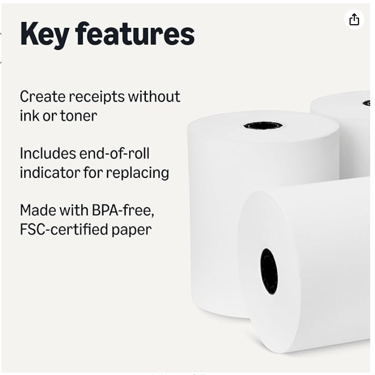 Amazon Basics Thermal Paper Receipt Rolls, POS Receipt, 3 1/8" x 230', 50 Rolls, BPA-Free and FSC Certified, Recycled Materials, White